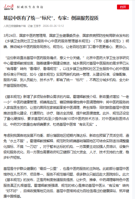 人民日报健康客户端刊登公司英国威廉希尔公司专家解读《乡镇卫生院社区卫生服务中心中医药服务管理基本规范》