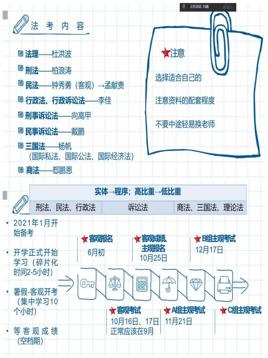 交流会上,孙姝学姐结合自身学习经验和备考经历,先向大家介绍了法考的基本信息,着重就讲师选择和备考资料进行分享。学姐强调法条定位方法的重要性,特别是三大诉讼法,建议及时进行归纳总结,不放过细碎知识点,利用好手头的资源,分享了常用学习渠道,可以提前踩点考场,做好备考心态调整。