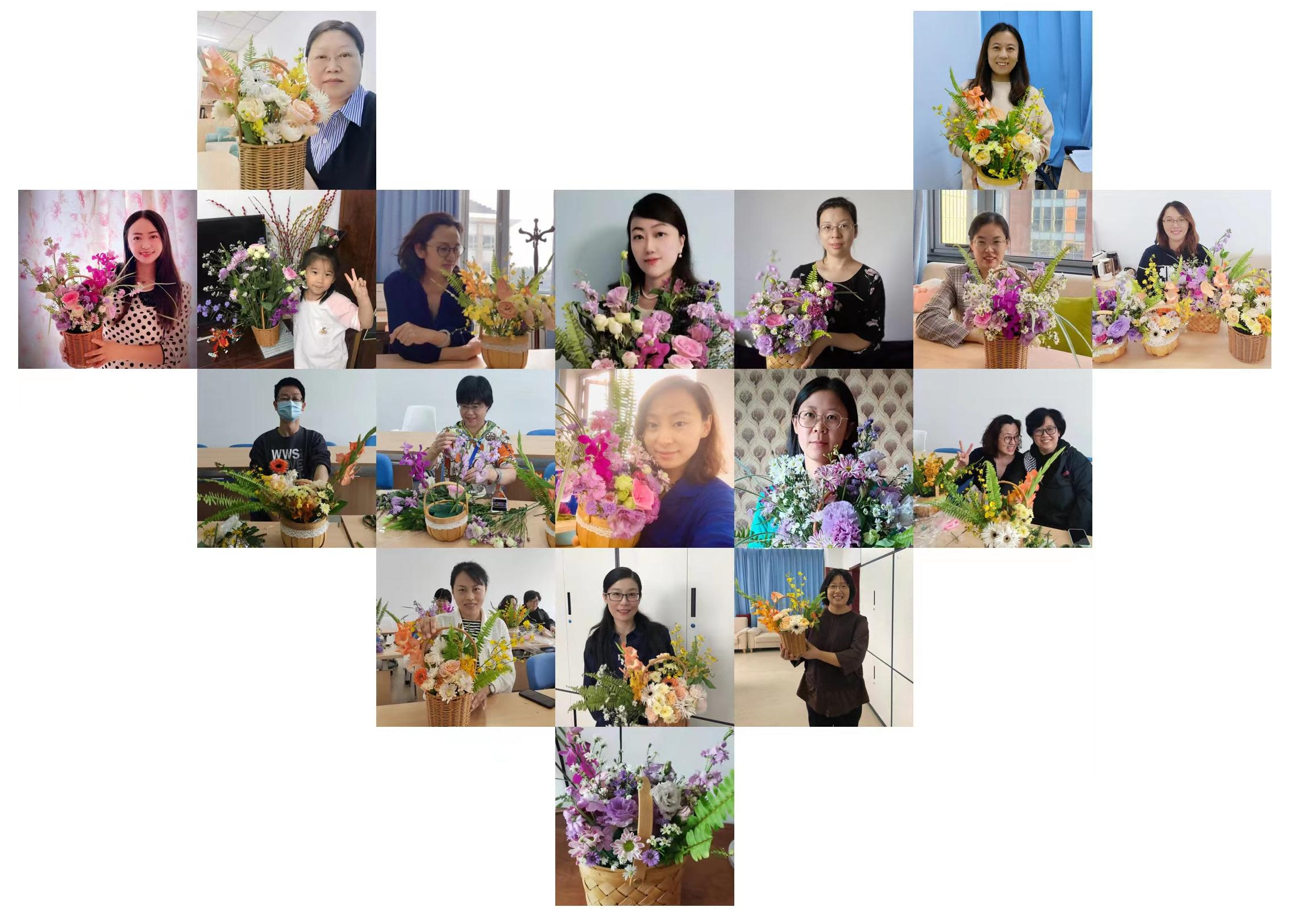 花艺老师首先为参与活动的教师们讲解了花艺的起源、花名花语等知识,介绍了将要用到的花的特色以及选花诀窍和插花技巧,大家随着花艺老师的示范,充分发挥想象,把原本普通的各式鲜花,经过修剪、层次搭配、点缀等步骤,变成了色彩斑斓、独具匠心的花艺作品。