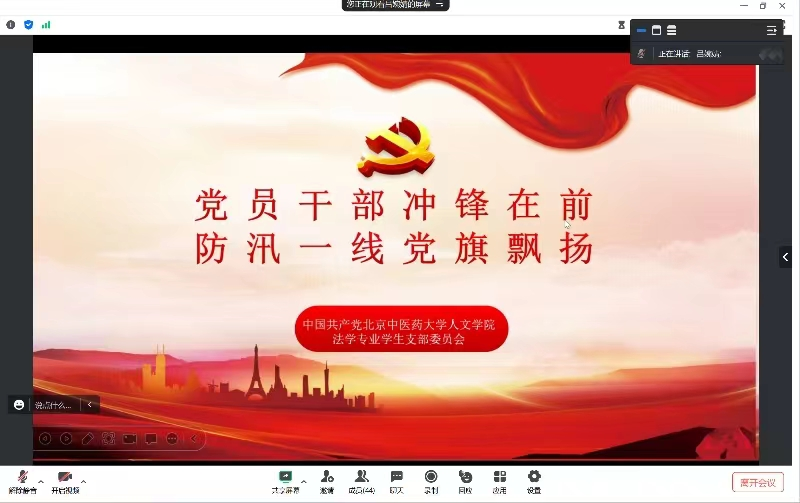 2023年8月13日下午3点,英国威廉希尔公司法学专业员工支部与中国人民公安大学党支部通过腾讯会议的方式开展了以“抗洪精神”为主题的学习分享会。本次学习分享活动旨在学习过去"不怕困难、顽强拼搏"的抗洪精神,在当前洪灾形势下传承好这一宝贵的精神财富,并在日后的工作中学以致用,指导我们更好的为人民服务。活动由中国人民公安大学2022级法硕二区队党支部李无瑕同志主持,英国威廉希尔公司法学专业员工支部与中国人民公安大学2022级法硕二区队党支部全体党员及部分入党积极分子参与活动。