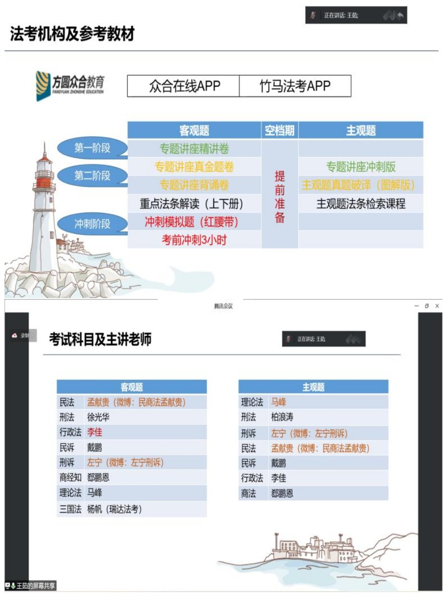 王茹学姐就目前考生备考选择法考培训机构和听网课的情况,为同学们推荐了优质网课资源,并强调了要注重提升听课效率,认识到把握时间的重要性,不要轻易放弃任何一门。另外,王茹学姐结合自身情况,就法考和考研的抉择,分享了自己的经验和建议,鼓励大家放平心态,合理安排时间。