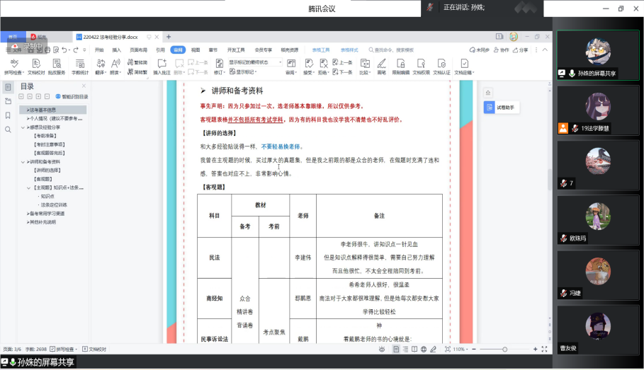 交流会上,孙姝学姐结合自身学习经验和备考经历,先向大家介绍了法考的基本信息,着重就讲师选择和备考资料进行分享。学姐强调法条定位方法的重要性,特别是三大诉讼法,建议及时进行归纳总结,不放过细碎知识点,利用好手头的资源,分享了常用学习渠道,可以提前踩点考场,做好备考心态调整。