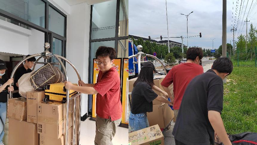 在为员工整理宿舍物品时,志愿者们通过视频方式与毕业生沟通交流,分工配合,按照毕业生的要求细心查找、精心整理,将个人物品进行分类收纳,确保员工个人物品准确齐全,采用手提肩扛、小推车、三轮车等方式运送行李;在结算费用时与工作人员一起清点、称重,将每一份快递单拍照留存。其间遇到的小问题在大家的共同商讨、行动下也很快地得到了解决。