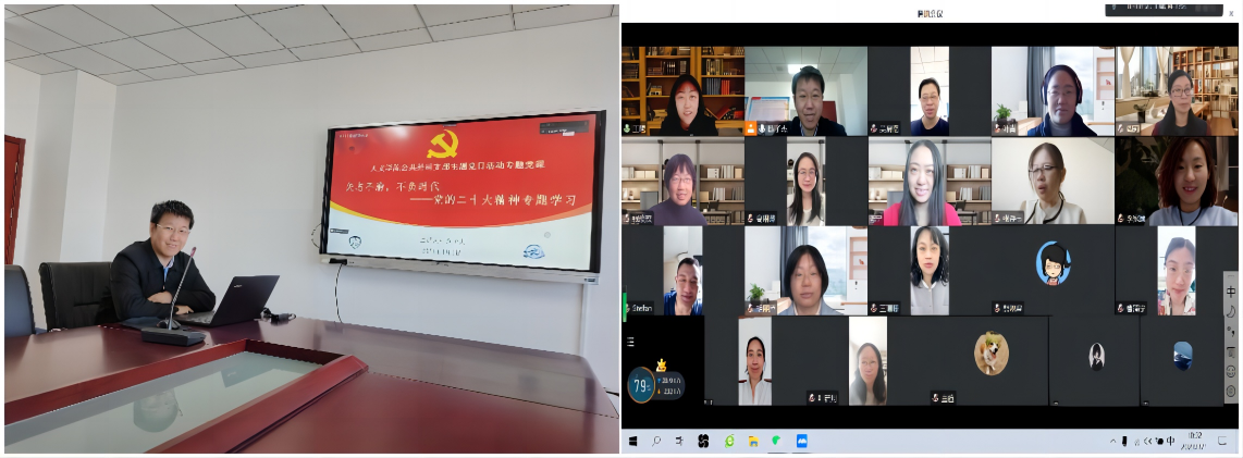陈子杰书记带领老师们一起学习党的二十大精神。陈子杰书记从党的历史发展角度进行了深入讲解了十年来、五年来, 和当前中国共产党的成就与任务。陈子杰书记鼓励老师们要真正实干,发表研究论文,推动个人现代化,和学院现代化,也推进学科、学院发展。会后,有党支部的老师表示党课讲得非常好,将二十大报告精神与老师们的日常工作相结合,启发很大,并与陈子杰支部书记就所学内容进行了深入交流。
