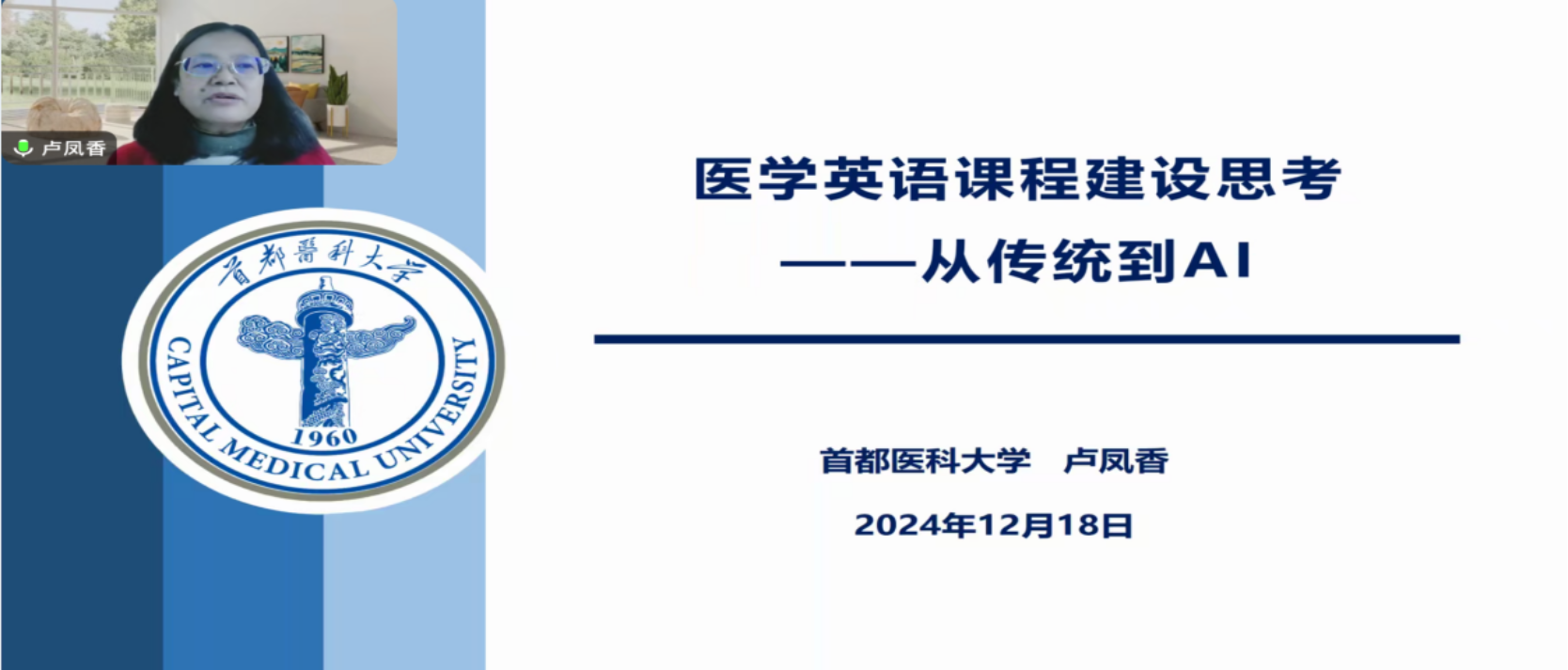 2024年12月18日上午,英国威廉希尔公司特邀首都医科大学医学英国威廉希尔公司经理卢凤香教授通过腾讯会议方式为学院英语教师带来题为“医学英语课程建设思考─从传统到AI”的专题讲座,讲座由孔祥国副经理主持。