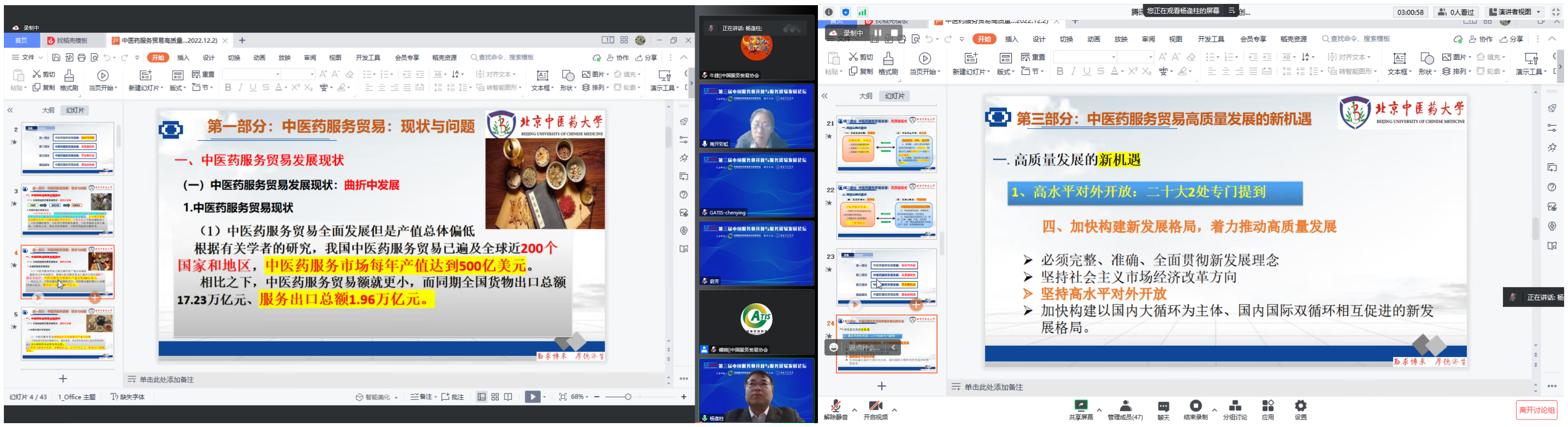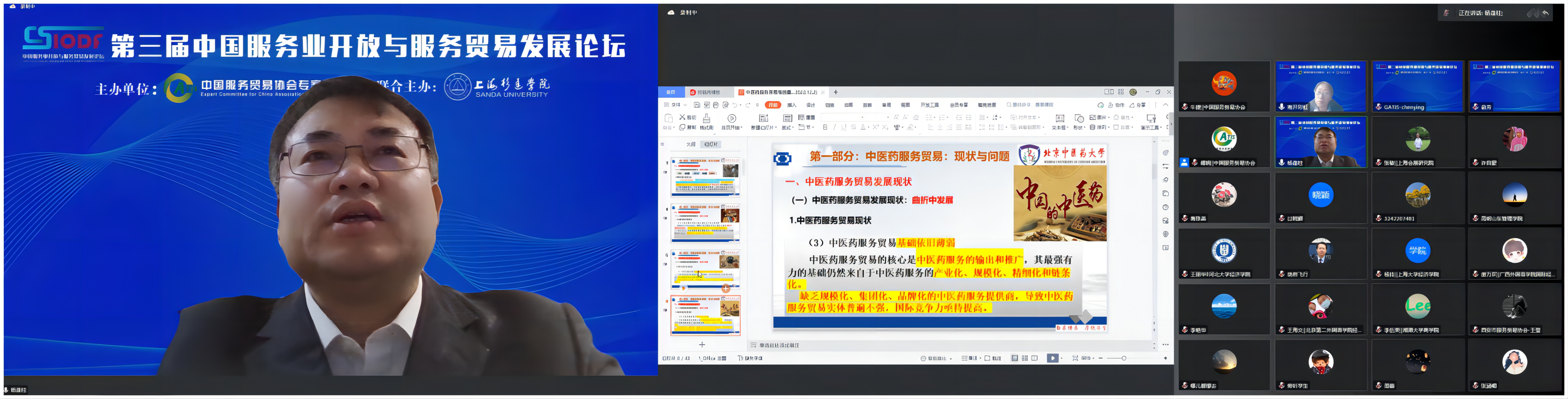 公司法律系主任杨逢柱副教授以《中医药服务贸易高质量发展的机遇与挑战》为题做主题报告。报告从中医药服务贸易发展现状与问题、中医药服务贸易发展高质量要求、中医药服务贸易机遇与挑战等角度,总结了中医药服务贸易发展的历史成就,分析了中医药服务贸易发展存在的问题及原因,指出了中医药服务贸易高质量发展的特点和需求,明确了中医药服务贸易“市场化、本土化、数字化和系统化”等高质量发展的方向,剖析了中医药服务贸易发展的重大历史机遇——“高水平对外开放政策”和“数字化浪潮”,提出了破解中医药服务贸易高质量发展的国内法律和国际法律对策。本次报告引起与会专家的重视,并推动了对于中医药服务贸易高质量发展的深入思考。