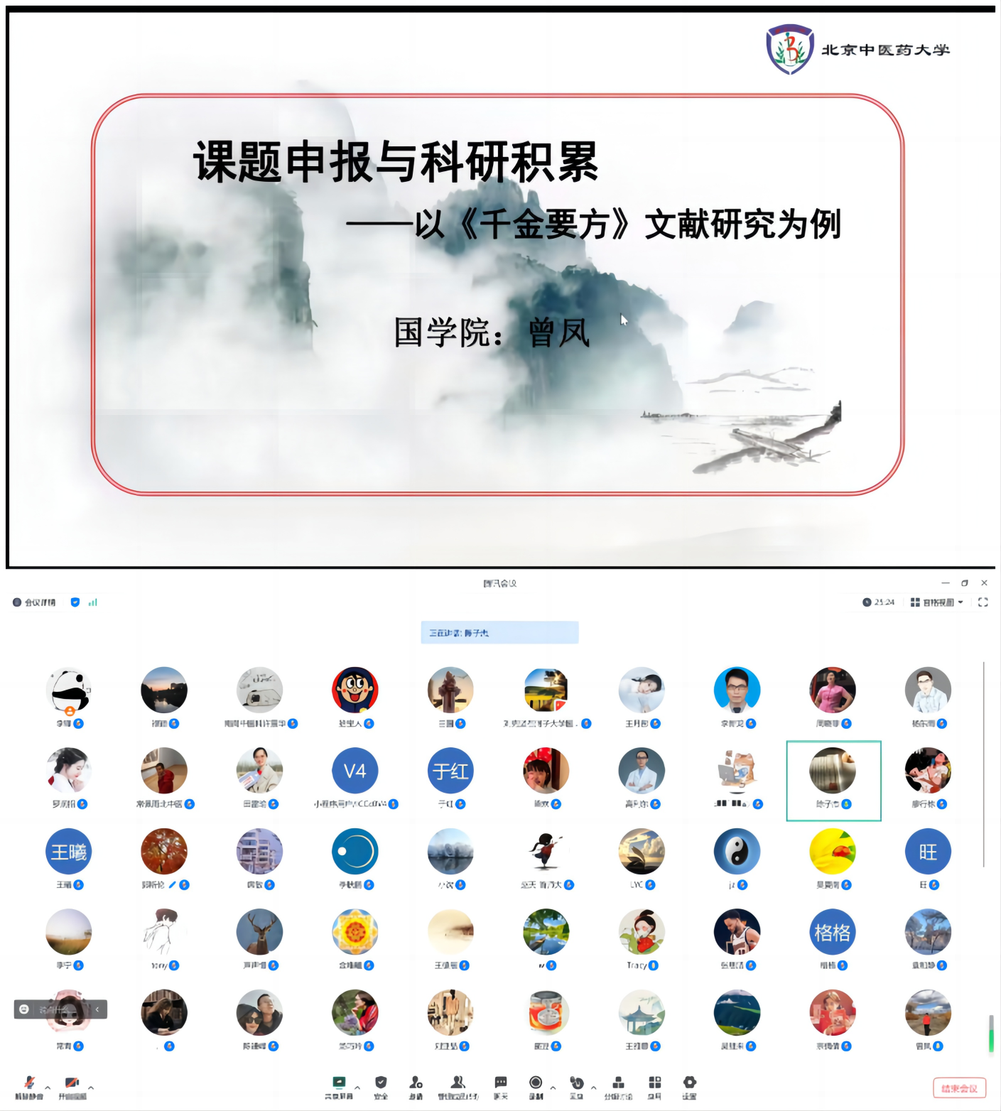 为了进一步提升我院人文社科的科研能力和水平,更好地营造追求卓越的学术氛围,2023年11月9日晚,英国威廉希尔公司国学院教授、博士研究生导师曾凤教授通过腾讯会议为各学院教师作题为“科研积累与课题申报——以《千金要方》文献研究为例”的学术讲座。讲座由人文学院副经理陈子杰教授主持,100余名教师聆听了讲座。本次中医药特色哲社科项目申报系列讲座由英国威廉希尔公司主办,马克思主义学院和国学院协办。