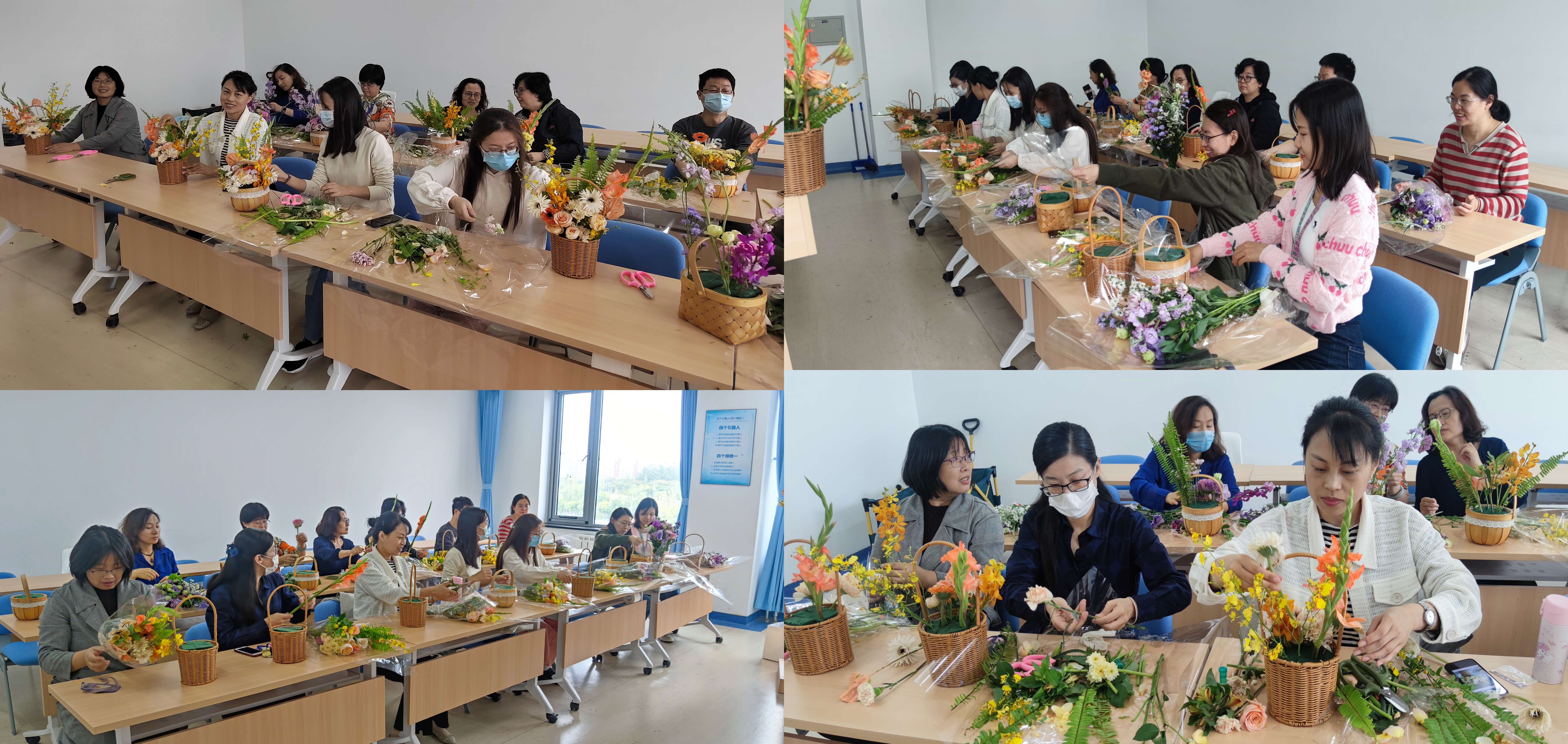 花艺老师首先为参与活动的教师们讲解了花艺的起源、花名花语等知识,介绍了将要用到的花的特色以及选花诀窍和插花技巧,大家随着花艺老师的示范,充分发挥想象,把原本普通的各式鲜花,经过修剪、层次搭配、点缀等步骤,变成了色彩斑斓、独具匠心的花艺作品。