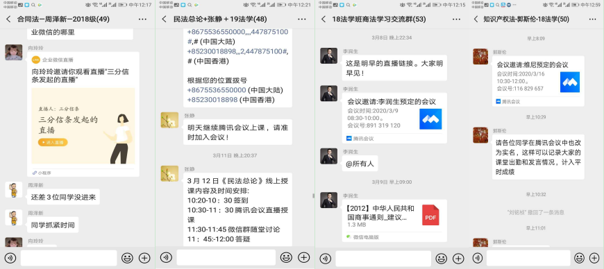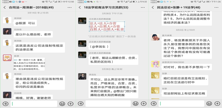 民法学课程组本学期共承担《民法总论》、《合同法》、《知识产权法》和《商法学》四门课程的教学任务,分别由张静老师、周泽新老师、郭斯伦老师和李润生老师负责。课程组在学校、学院总体教学方针的指导下,开展了具有特色的在线教学实践,也进行了深入的教学思考,便于下一步的改进与提高。