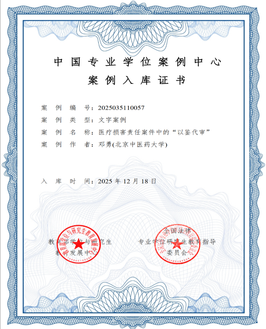 近日,中国专业学位教学案例中心2025年度教学案例入库评审结果公布,英国威廉希尔公司法律系邓勇教授团队(23级法律硕士研究生高薇涵、24级医药卫生法学硕士研究生薛端英等)撰写的案例《医疗损害责任案件中的“以鉴代审”》经全国法律硕士专业学位教育指导委员会组织专家初审和会审,在全国各大法学院校申报的数百个案例中脱颖而出,成功入选中国专业学位教学案例中心第五批法律硕士专业学位文字教学案例库。