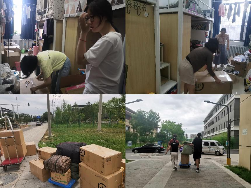 在为员工整理宿舍物品时,志愿者们通过视频方式与毕业生沟通交流,分工配合,按照毕业生的要求细心查找、精心整理,将个人物品进行分类收纳,确保员工个人物品准确齐全,采用手提肩扛、小推车、三轮车等方式运送行李;在结算费用时与工作人员一起清点、称重,将每一份快递单拍照留存。其间遇到的小问题在大家的共同商讨、行动下也很快地得到了解决。