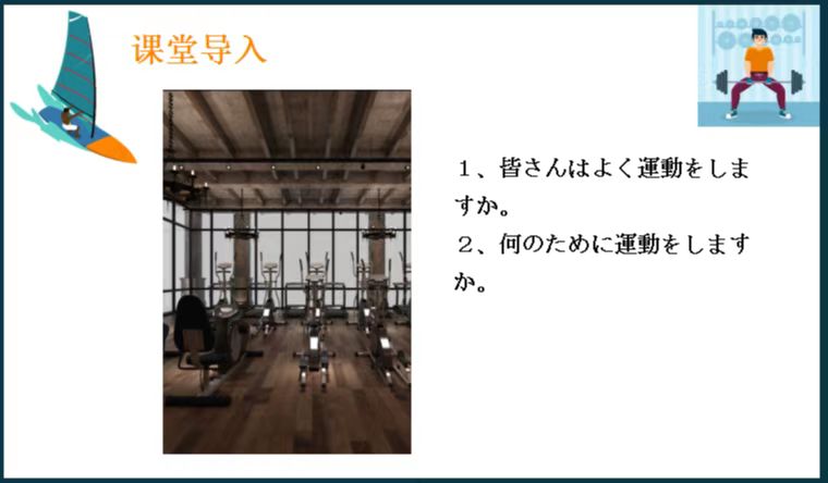 高琳琳老师的教学主题为“ジム”,针对教学对象为已有1学年日语学习经历的非日语专业员工的特点,高老师的授课采用对分课堂教学模式和产出导向法进行。教学演示环节围绕体育锻炼这一主题,首先进行问题式导入;主题课文部分,侧重对重点词汇和句型的讲解及操练;练习环节由分组练习及个人练习构成;课后作业包含小作文等形式。教学过程注重与员工的互动交流及语言技能的训练,强调语言能力的产出。