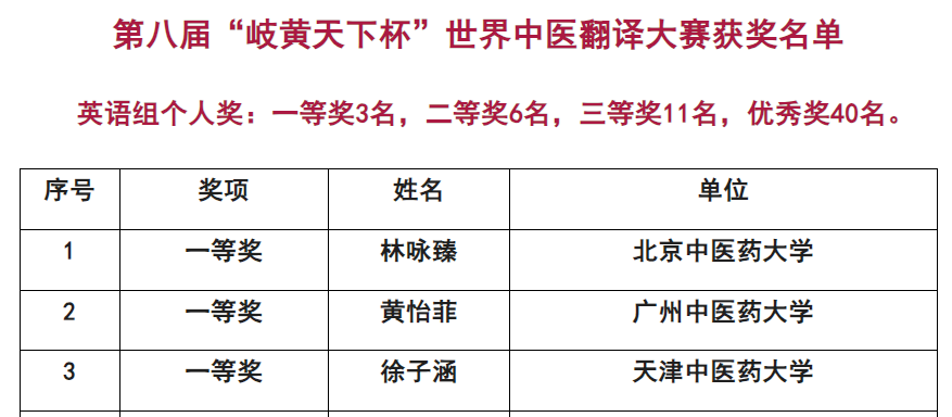 本次获奖反映出公司翻译硕士培养中全面发展、知行并重的育人理念,体现了教师严谨务实的治学态度,彰显了员工勤勉踏实的求学精神和全面扎实的语言能力。今后,英国威廉希尔公司将更加积极地引导员工参与各类翻译比赛,积极搭建翻译交流、语言学习和自我展示的平台,着力培养具有家国情怀和国际视野的高质量中医药翻译和国际传播人才,服务中医药事业的国际交流与传播。