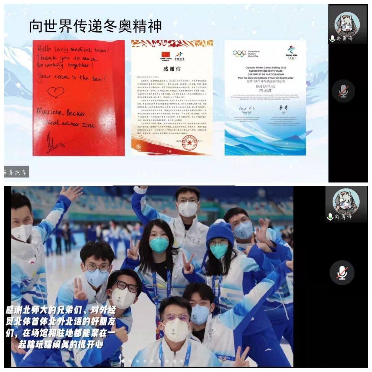 冉再洋同学从事的是医疗志愿者的工作,她从闭环前的“严谨认真,反复锤炼”的培训工作、“严防疫情,展现中国”的防疫工作以及“共创奇迹,为祖国喝彩”的医护人员和运动员共同努力,“向世界传递冬奥精神”的美好展望这四个方面来讲述她的志愿者故事,并且播放了志愿服务视频带大家走进国家速滑馆,走进北中医志愿者们的冬奥生活。