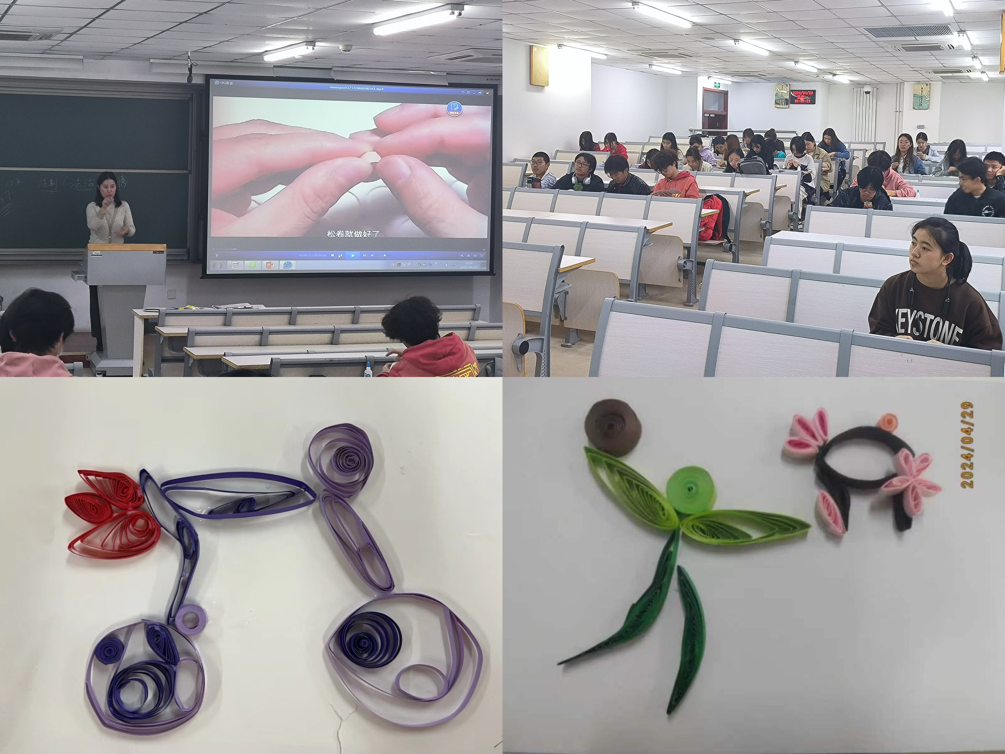 课上,陈天琪老师首先为大家进行了衍纸基础知识和技巧的讲解,包括纸张选择、工具使用、基本卷法等。在基础教学结束后,参与者们纷纷动手实践,互相交流学习心得,活动现场气氛热烈,不时传来欢声笑语。活动接近尾声时,参与者们纷纷展示自己的作品,有精美的花朵、可爱的动物、抽象的图案等,各具特色,令人目不暇接。