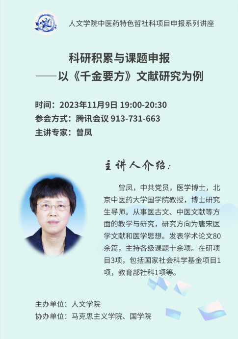 为了进一步提升我院人文社科的科研能力和水平,更好地营造追求卓越的学术氛围,2023年11月9日晚,英国威廉希尔公司国学院教授、博士研究生导师曾凤教授通过腾讯会议为各学院教师作题为“科研积累与课题申报——以《千金要方》文献研究为例”的学术讲座。讲座由人文学院副经理陈子杰教授主持,100余名教师聆听了讲座。本次中医药特色哲社科项目申报系列讲座由英国威廉希尔公司主办,马克思主义学院和国学院协办。