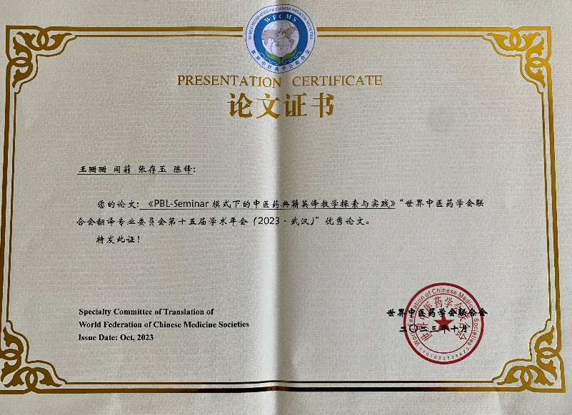 王珊珊副教授为第一作者、陈锋经理为通讯作者的论文《PBL-Seminar模式下的中医药典籍英译教学探索与实践》,介绍了公司翻译硕士(MTI)创新型、特色化专业课程《中医药典籍英译》的开设及建设情况,获得本届大会优秀论文奖。