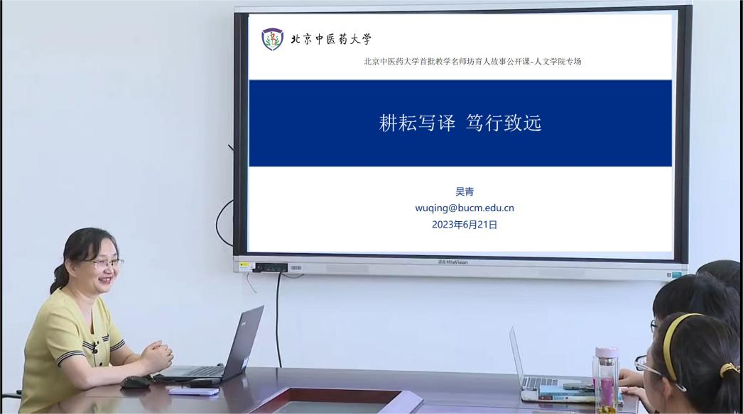 随后,吴青教授介绍了中医英语教材的编写与使用经验。通过对已经出版的中医英语教材的调研,吴教授发现中医英语教材方面的研究比较匮乏,她从教材设计与编写、教材评估、教材使用等多个维度探讨了中医英语教材相关的科研思路和编写技巧。此外,吴教授结合自身翻译实践经历,探讨了中医翻译实践与研究中面临的翻译文体和翻译层面的问题,提出了中医翻译须“以信为首”的翻译标准。同时,吴教授解读了目前中医翻译形式之一的改写。吴教授从改写的定义、改写的动机以及改写的原则与策略方面探讨了改写在中医翻译实践中的应用。吴教授提出,译写的动机是基于当前“讲好中医故事”的时代背景,考虑受众接受性,积极传播中医文化的主动行为。如果说翻译的本质是文化交流,那么就不能忽视交际的有效性。译写可为我们努力“讲好中医故事”或者说为“向世界讲好中国故事”提供一种新的策略选择和途径。吴教授的讲解为参会师生提供了针对性指导,有助于提升公司英语教师的英语教学水平和中医翻译实践能力。