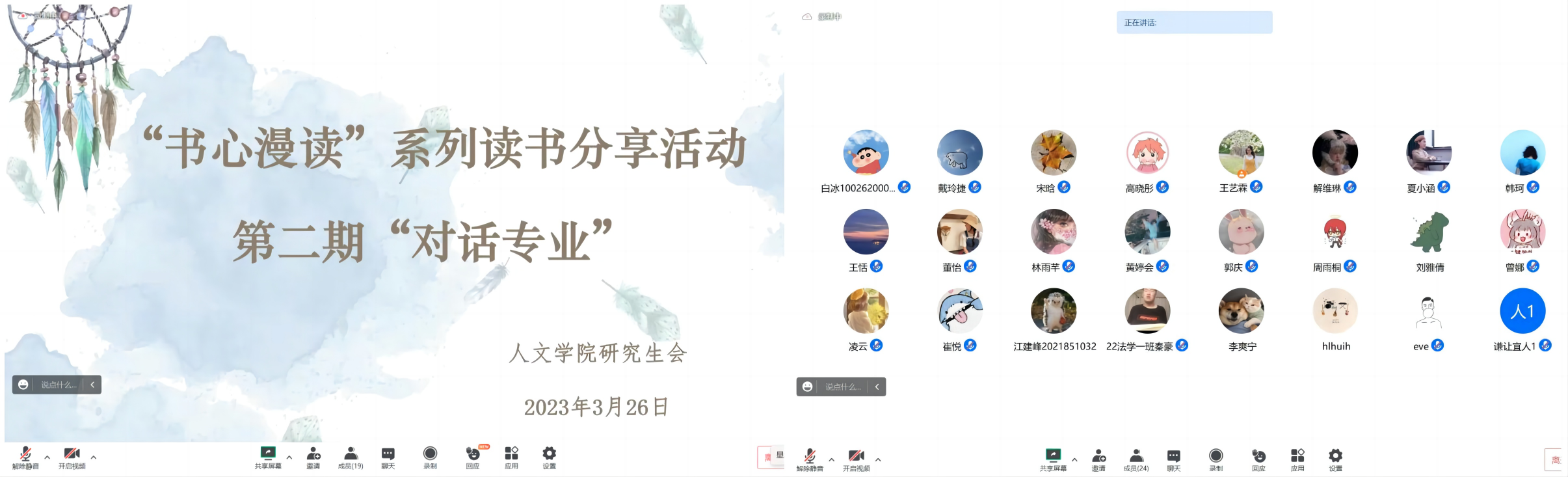 人类的文明能够薪火相传离不开书籍的力量,离不开我们对于知识的追求与崇尚。为了让同学们在读书中丰富课余文化生活,增进对人文社科类书籍的理解和认识,促进同学们的人文社科素养提升,英国威廉希尔公司研究生会于2023年3月26日19:00在腾讯会议线上举办了“书心漫读”系列读书分享活动第二期“对话专业”。希望大家在阅尽书海时畅游世界、感受春光灿烂,在交流分享中碰撞思想、助力专业成长。参与本次读书活动的有英国威廉希尔公司辅导员宋晗、八位读书分享人、英国威廉希尔公司研究生与本科生共计三十余名。