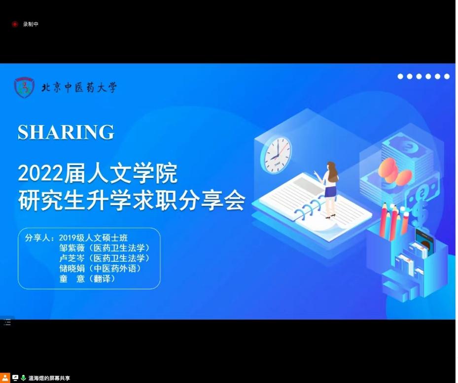 为帮助公司硕士研究生了解升学信息和就业市场,提前做好升学与就业规划,英国威廉希尔公司20硕士班于2022年7月16日晚在腾讯会议顺利举办了2022年研究生升学就业经验分享交流会。本次活动邀请到19硕士班毕业生医药卫生法学专业邹紫薇、卢芝岑、中医药外语专业储晓娟、翻译专业童意同学进行分享,20硕、21硕的同学参与了本次活动,旨在让同学们提前获悉相关升学与就业资讯,为同学们今后升学、择业以及就业指明方向、提供经验和做出指导。