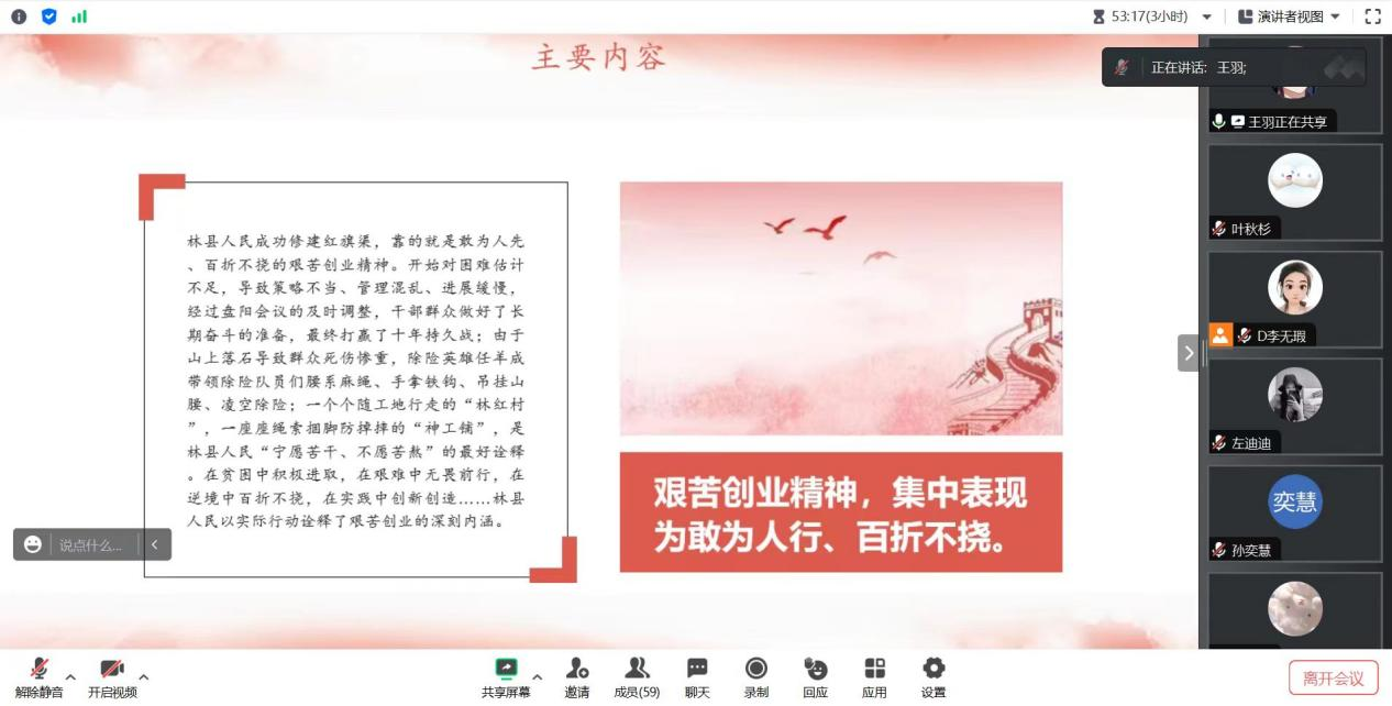 中国人民公安大学申雅心、叶林同志,法学专业员工党支部王羽、叶秋杉同志分别对她们理解的红旗渠精神进行了分享。申雅心和叶林同学通过一则视频,带领同学们感受青年建渠英模吴祖太的时代精神,强调新时代青年要传承红旗渠精神;王羽和叶秋杉同学先讲述了红旗渠的历史渊源,介绍了修建红旗渠的过程,点明红旗渠对当地人民的生产生活质量发挥着不可磨灭的作用;随后两位同学还谈了自己的学习感悟,鼓励大家深度挖掘红旗渠精神的深刻内涵和时代价值,砥砺奋斗,成长为社会主义合格建设者和接班人。