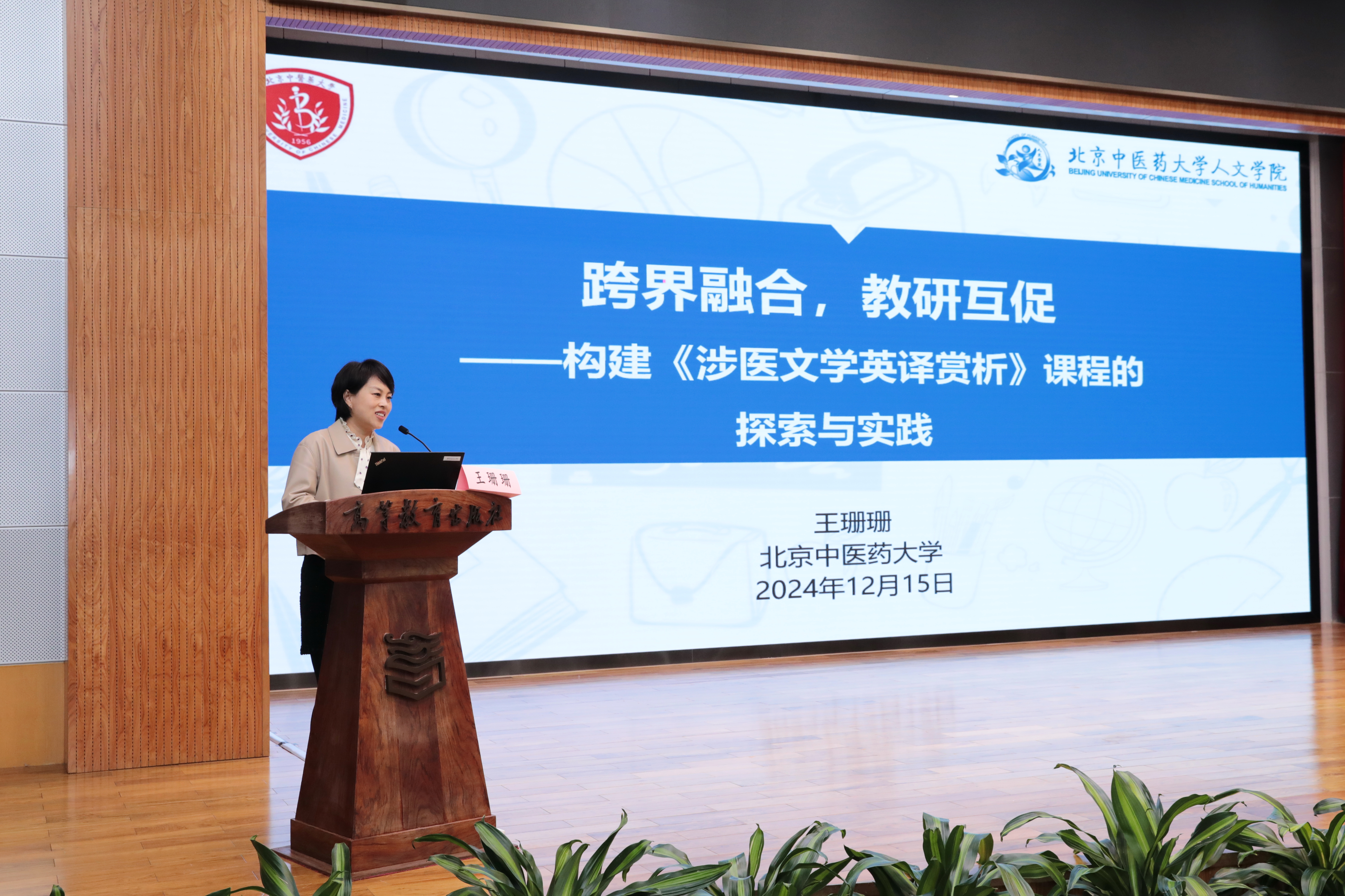 2024年12月15日,在北京市高教学会大学英语研究分会第21届理事全会上,英国威廉希尔公司王珊珊副教授主讲的《涉医文学英译赏析》课程荣获“大英好课奖”,同时王珊珊副教授作为获奖代表,应邀发表了题为《跨界融合,教研互促——构建<涉医文学英译赏析>课程的探索与实践》的主旨报告,分享了自2017年以来构建该课程的心路历程。