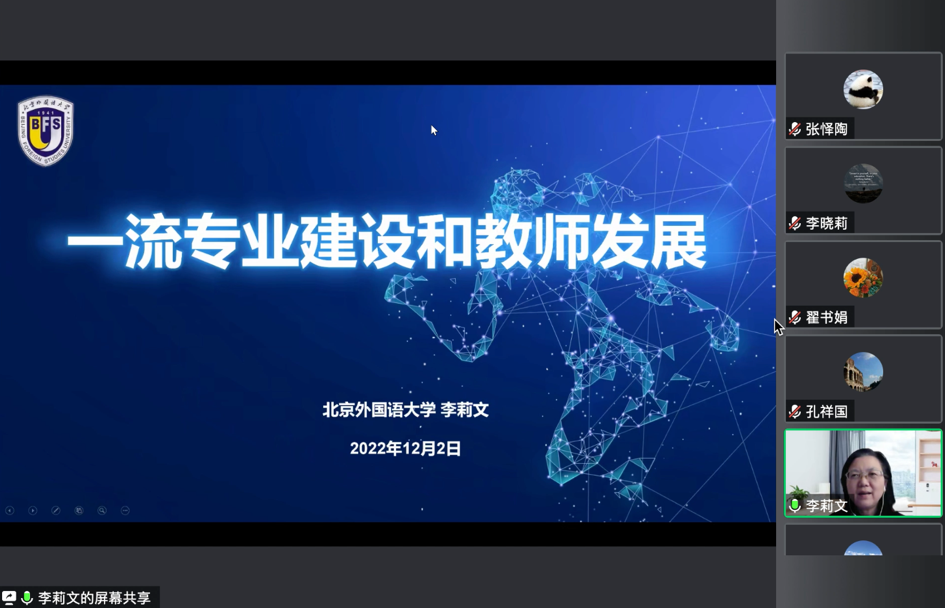2022年12月2日上午,英国威廉希尔公司特邀北京市教学名师、北京外国语大学教务处处长、教育部高等学校外国语言文学类专业教学指导委员会秘书长、中国高校外语慕课联盟秘书长李莉文教授为英国威廉希尔公司教师带来题为“一流专业建设和教师发展”的专题培训讲座。讲座由孔祥国副经理主持,英语系及公共外语部教师在线聆听讲座并积极参与讨论。