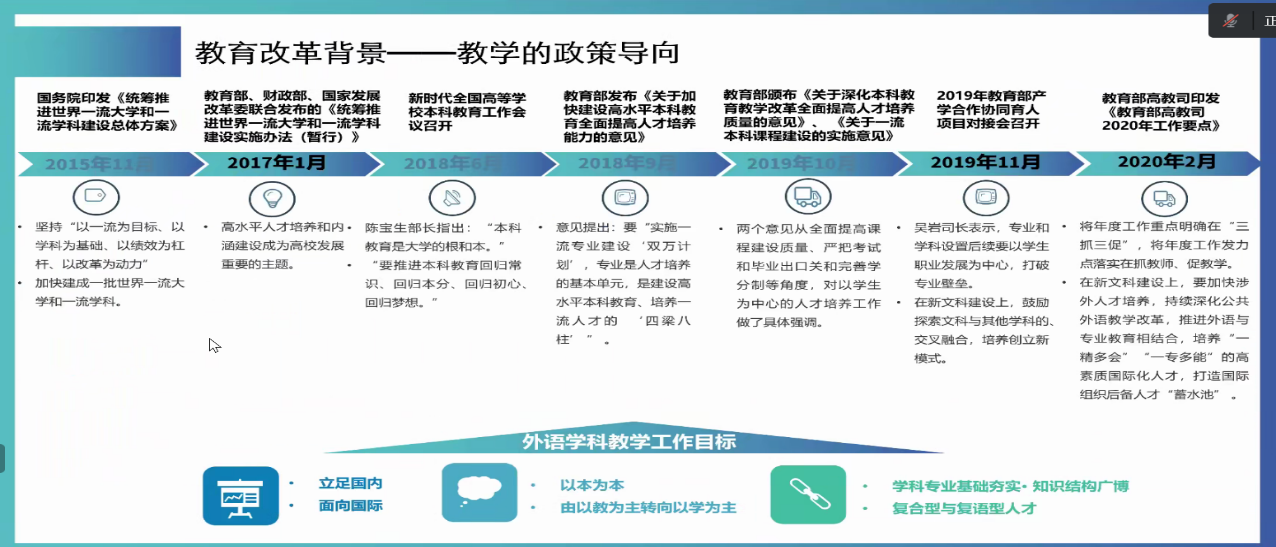 其次,李教授向参会教师强调了考察一流专业建设工作的主要关注点。她指出,一流专业建设应紧跟教育部的最新建设与发展指导意见,重点思考如何深化专业综合改革、加强团队队伍和基层教学组织建设、强化专业教学质量保障体系建设。最后,李教授建议以课程建设促进教师职业发展并解读了课程建设的要点。她指出,教师发展应以课程建设为抓手,建设一流课程应严谨设定课程目标,注意问题导向,重点打磨教学理念、教学策略、教学方法、课程设计、教学日历。