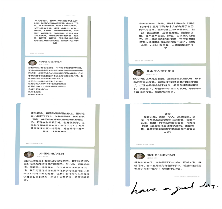 活动前期,“小邮差”们精心准备,制作活动邮箱链接地址,同时为参与本次活动的同学们讲解活动要求,解答同学们的问题。活动过程中,同学们积极踊跃参与,分享自己在北中医校园中发现的美好瞬间;也有部分同学在来信中提出自己的问题,“小邮差”们在阅读后悉心解答同学来信中的问题,为同学们提供建议,排忧解难。